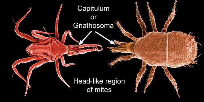 Misinterpretations allowed: Although the overall appearance of these mites can be somewhat insect-like (especially if they are larvae with only three pairs of legs), the capitulumgnathosoma:
