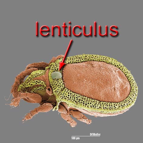 Several groups of oribatid mites appear to have independently evolved a new type of light-sensitive organ called the lenticulus. This structure is median, unpaired, and often a simplesimple: