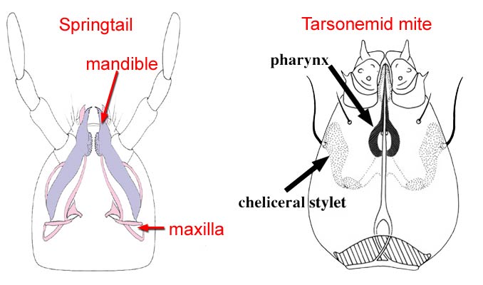 The mouthparts of Collembola, Diplura, Symphyla, Protura, and some mites are difficult to see because they are enclosed within the head or gnathosomal capsulegnathosomal capsule: