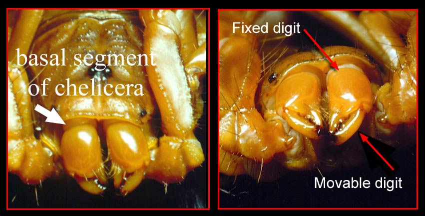 The first pair of limbs in arachnids are called chelicerae. Primitively these are pincer-like and composed of 3-segments: basal articlebasal article: