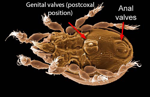 In many mites, the female genital opening migrates between the coxae. Also, many groups of mites evolved secondary insemination systems that are dissociated from the ovipore.