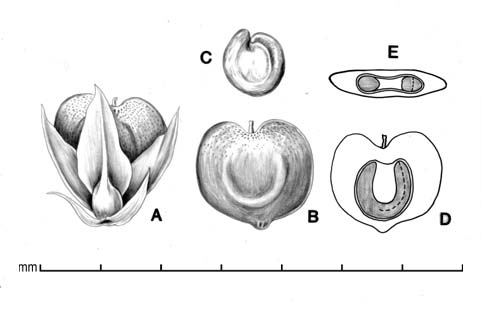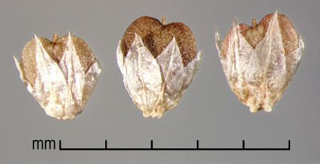 Fruit a utricle with attached perianth, 1.8–3 mm long, 1.3–2 mm wide, 0.3–0.7 mm thick. Perianth shorter than or same length as utricle; tepals about 2 mm long, lanceolate, scarious, white, lustrous, finely striate. Utricle strongly compressed, broadly obcordate. Scar knobby. Surface somewhat glistening, cream to light beige-yellow, minutely pebbled.