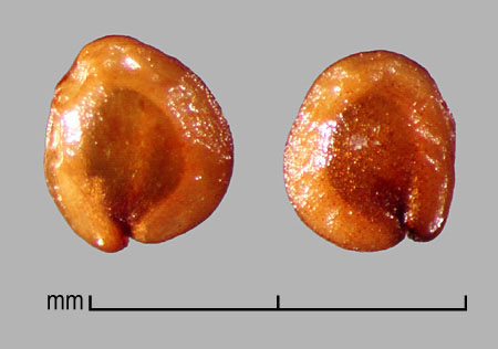 Seeds lenticular, ovate in outline, ca. 0.9–1.5 mm long, 0.8–1 mm wide, 0.3–0.6 mm thick, with marginal hilar notch at broad end. Hilum small, inconspicuous. Testa glossy, smooth, dull orange or dark brown to black, with faintly visible reticulation. Embryo peripheral, visible on surface under testa, encircling perisperm.