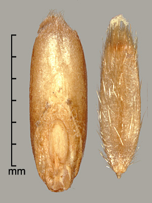 caryopsis shape | oblong, depression caused by awn on embryo side starts below the middle of the caryopsis | long, narrow, depression caused by awn on embryo side starts above the middle of the caryopsis |
