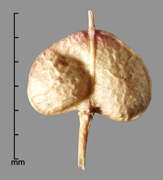 Fruit a 2-chambered silicle with 1–2 seeds per chamber, cordate, compressed in cross-section, 2–4 mm tall, 3–5 mm broad, with conspicuous reticulation on surface.