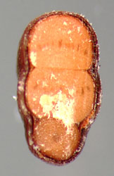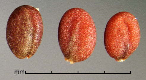 Seeds elliptic to obovate with a notched, bluntly pointed base, 1.2–2.2(3) mm long, 1.0–1.5(1.7) mm wide, (0.5)1.0–1.25 mm thick, cotyledon edge thicker than radicle edge, cross sectional outline ovate. Testa dull, dark reddish-brown or deep purplish-red, sometimes with yellowish tinge. A faint groove or line runs from the base, gradually veering away from the margin and ending at about the middle or upper one-fourth of the seed. Surface minutely granular. Hilum in basal notch, inconspicuous, often hidden beneath funiculus or funicular material. Embryo bent, cotyledons incumbent, radicle same length as cotyledons; endosperm nearly absent.