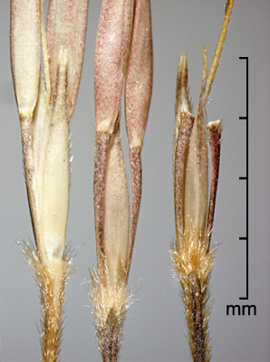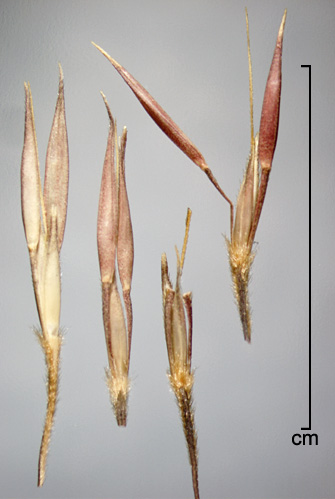 Spikelets heteromorphic. Sessile spikelets 3.4–4.3 mm long (not including callus), 0.5–0.6 mm wide, of 1 fertile floret and 1 basal sterile lemma. Callus 3–7 mm long, pointed, +/– densely covered with golden-colored hairs. Glumes dissimilar, margins of upper glume overlap lower glume; lower glume cartilaginous, flatter than upper glume, 2-keeled on margins of upper half, keels scabrous, apex truncate; upper glume acuminate to mucronate, 1-keeled in center, keel scabrous. Sterile lemma hyaline. Fertile lemma with apical awn 3.5–8 mm long. Pedicels mostly glabrous, more than half the length of the sessile spikelet, slender. Pedicellate spikelets 4.4–7.1 mm long, sterile; glumes acute to acuminate.