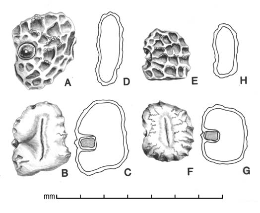 A, subterranean seed showing embryotega; B, subterranean seed showing hilum; C, subterranean seed longitudinal section showing embryo, D, subterranean seed longitudinal section; E, aerial seed; F, aerial seed showing hilum, G, aerial seed longitudinal section showing embryo; H, aerial seed longitudinal section; drawing by Lynda E. Chandler |