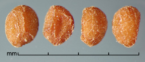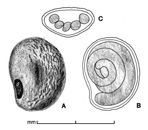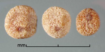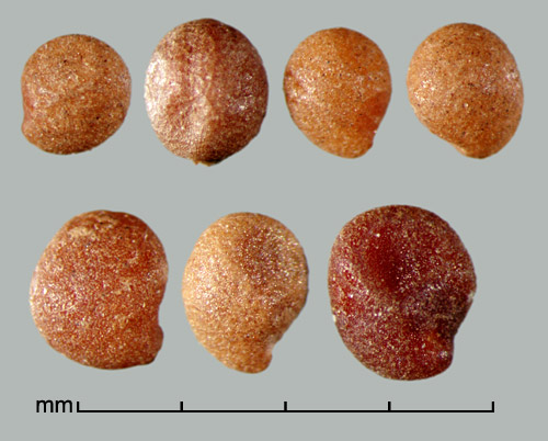 Fruit a round, 2-loculed capsule containing up to 4 seeds. Seeds variously shaped: round, ovate or obovate, to oblong in outline, and globose, subglobose, ovoid, or angular in three dimensions, may be flat or depressed on 1 or 2 sides; 0.5–5 mm long, with most ca. 1–2 mm long. Variously colored; from light gray, yellowish, or reddish, to dark brown. Surface finely to coarsely rough, granular, rugose, pitted, reticulate or scurfy. Scar area small, distinct, in the middle of which the hilum appears as a raised line, point or slit. Embryo linear, coiled, normal cotyledons lacking; endosperm hard and clear or semi-transparent.
