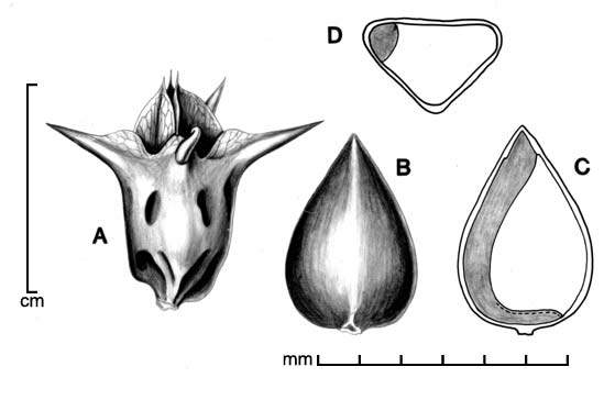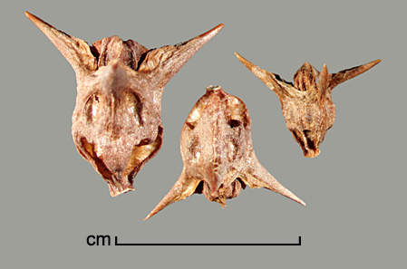 Fruit an achene enclosed in persistent hardened perianth 4.5–11(12) mm long, 2.5–5.5 mm wide and thick (not including spines). Three sided, each side with 2 depressions in upper portion, and 2 depressions in lower portion; all the lower depressions together form a tapered base. Toward the apex, each edge (of outer segments) extends outward into a straight, rigid, sharp spine. Three bract-like inner segments form a connivent apex. Cross section slightly triangular to nearly round. Surface dull, light to dark straw-colored to brown; dusty appearance, smooth to rough. Scar cream-colored, irregular in shape, with 3–6 small holes. Embryo peripheral, cotyledons shorter than radicle; endosperm readily visible.
