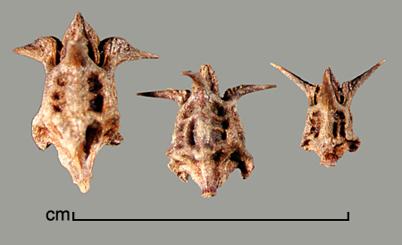 Fruit an achene enclosed in persistent hardened perianth, 4–8 mm long, 2.4–5 mm wide and thick (not including spines). Three sided, each side with 6–10 depressions in upper portion, arranged in 2 columns, and 2 depressions in lower portion; all the lower depressions together form a tapered base. Toward the apex, each edge (of outer segments) forms a rigid recurved spine. Three inner segments form an erect, connivent apex taller than spines. Cross section triangular to nearly round. Surface dull, light to dark straw colored or reddish-brown; dusty appearance, rough. Scar variable. Embryo peripheral, J-shaped, cotyledons longer than radicle; endosperm readily visible.