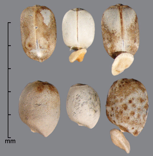 Fruit a strongly trilobate and explosively dehiscent capsule, with one seed in each of the three chambers. Capsule 3–4 mm long, 4–5 mm diameter, smooth. Seeds broadly ovate to broadly oblong, subterete, 2.0–3.0 mm long, 1.5–2.0 mm in diameter; base of seed flat, oblique, with hilum usually obscured by persistent cartilaginous caruncle. Caruncle boat-shaped, up to 1.5 mm long, mildly sparkly, cream-colored, stalked, appressed obliquely to testa. Raphe a prominent dark line extending longitudinally from the hilum to the chalazal area at the apex. Chalaza prominent, round, depressed, 0.7 mm across. Testa minutely pitted and appearing smooth, greyish-white to bluish-grey to tan, and usually mottled or flecked with brown or black markings. Hilum darker than testa, grading into raphe. Embryo spatulate; endosperm readily visible.