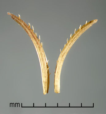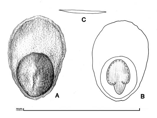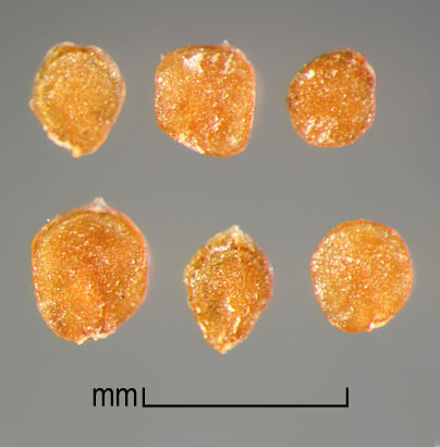 Fruit a capsule with 20–30 seeds. Seeds compressed, obovate or elliptic to round, 0.4–0.62 mm long, 0.3–0.5 mm wide, 0.02–0.06 mm thick. Entire margin winged; wing narrow or barely apparent. Testa minutely pebbled, glistening, orange-yellow to brownish-yellow, translucent where seed particularly thin. Hilum marginal, a raised narrowly elliptic rim. Embryo spatulate.