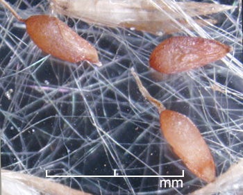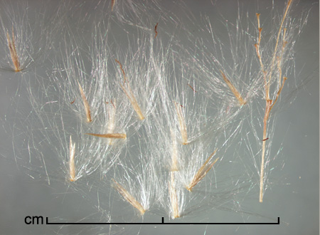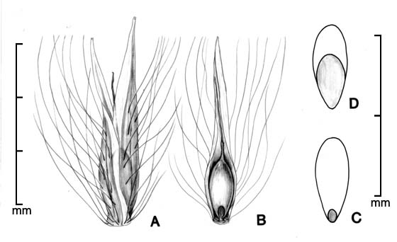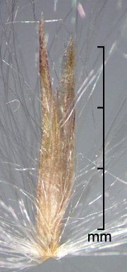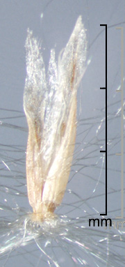 Spikelets subterete, 3.5–5 mm long (excluding callus hairs), of 1 fertile floret and 1 (usually absent) basal sterile lemma. Spikelet callus with silky hairs 7–13 mm long. Glumes 2.4–4.5 mm long, lanceolate, pointed. Sterile lemma (if present) ca. 1 mm long, hyaline. Fertile lemma and palea shorter than glumes, hyaline. Styles 1.1–4.7 mm long, persistent, at least in part. Caryopsis oblanceolate, 0.8–1.5 mm long.