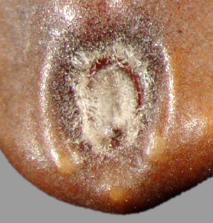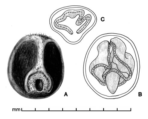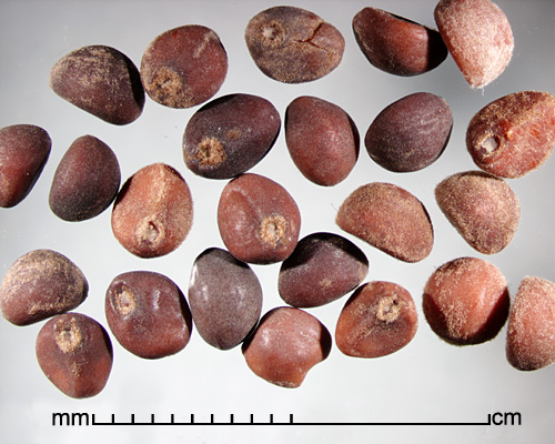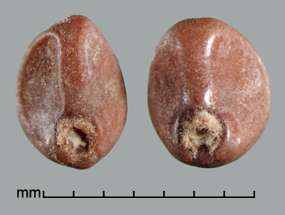 Fruit a capsule, with 1–4 seeds. Seeds 3-sided, 4.5–5.5 mm long, 3.5–4.5 mm wide, 2.5–3.5 mm thick. Two ventral faces usually flat, less often slightly concave, back arched, ventral view outline broadly elliptic or ovate to nearly round, lateral view outline depressed ovate to D-shaped; cross section sector-shaped with margins +/– keeled. Testa dull, light to dark reddish-brown, occasionally dark grey. Surface often minutely stippled. Glabrous or sparsely covered (occasionally heavily covered) with short tawny hairs. Hilum ca. 1 mm wide, whitish, emarginate, slightly recessed and surrounded by an omega-shaped hilar ridge fringed with tawny hairs. Embryo folded; endosperm present.
