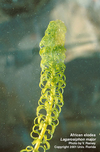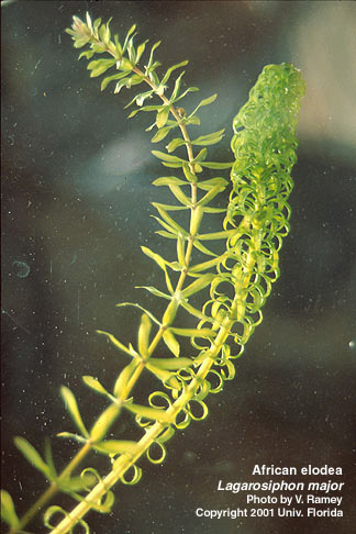 Was mistakenly thought to be Elodea canadensis Mitchx. in New Zealand and is often called Elodea crispa in the aquarium trade. Recurved leaves, spiral leaf arrangement and downward-curving stems towards apex help to distinguish Lagarosiphon major from Egeria, Elodea, and Hydrilla.