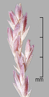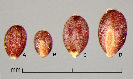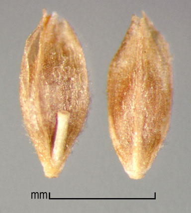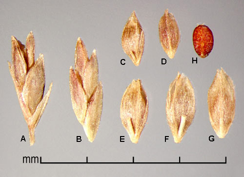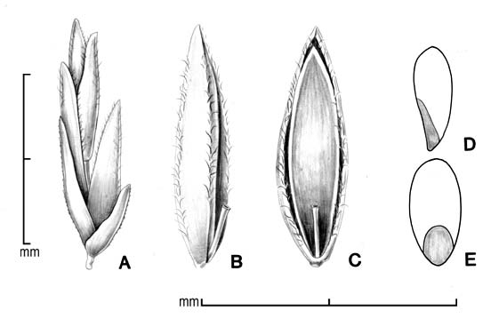 Spikelets laterally compressed, 2–3.7(4.2) mm long, 0.75–1.3 mm wide, of 5–6 fertile florets, rachilla elongated between florets. Glumes hyaline to membranous, keeled, keels minutely barbed, lower glume usually shorter than upper glume. Floret dorsally compressed, elliptic, with narrow rachilla fragment ca. 0.3 mm long. Lemma (0.8)1.2–1.7(1.85) mm long, membranous to hyaline, keeled, palea twice keeled, both lemma and palea glabrous to hairy on surface, keels +/– hairy and minutely barbed. Caryopsis obovate, dorsally compressed, reddish-brown, 0.5–1.9 mm long, surface striate; embryo large; hilum small, round, indented.