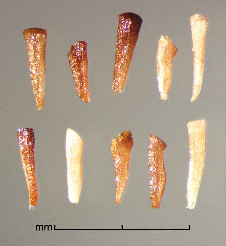 Fruit a capsule containing 200–300 seeds. Seeds angled, outline variable but most commonly narrowly triangular, 0.6–1.2 mm long, 0.2–0.3 mm wide, 0.1–0.3 mm thick, with ends usually truncate; cross section 4–5 sided. Testa glossy, straw-colored to brown, often brown-speckled, minutely granular. Hilum inconspicuous. Embryo spatulate; endosperm absent.