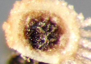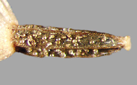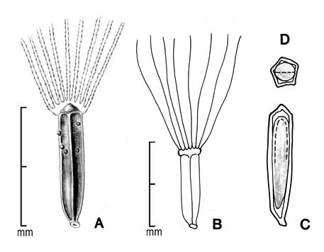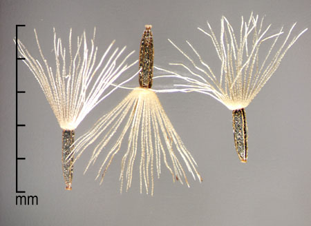 Fruit an achene, narrowly oblanceolate to narrowly oblong, sometimes slightly curved, 1.2–2(3) mm long, 0.2–0.6 mm in diameter, with 4–5 light-colored longitudinal ribs; cross section 4 or 5 sided. Surface blackish-brown, minutely granular, with few to many conspicuous drops of amber resin. Base narrows, then flares into a straw colored, irregularly cup shaped basal scar. Pappus persistent, one row of 32–38 ivory to light amber finely barbed bristles, 2–3 mm long. Style base inconspicuous. Apex horizontal, blackish-brown, granular. Embryo straight, spatulate; endosperm absent.