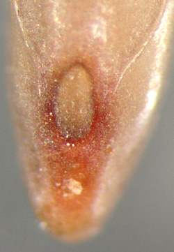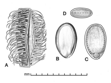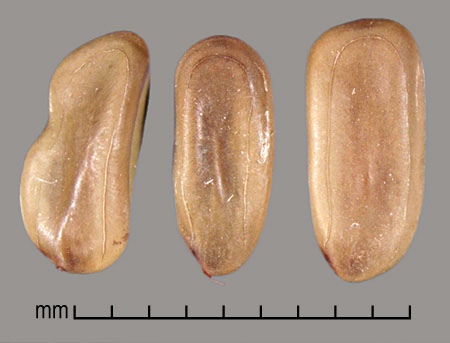 Seeds oblong in outline, umbo absent, 4–8 mm long, 2–4 mm wide, 1.75–2 mm thick, depressed on faces, irregularly oblong in cross section. Dull, semiglossy, smooth. Pleurogram open, distinctly wide and closely following margin; pleurograms on each face nearly connected at base. Lens elliptic, same color or lighter than testa, surrounded by darker halo, flush or slightly raised. Embryo investing, cotyledons much longer than radicle.