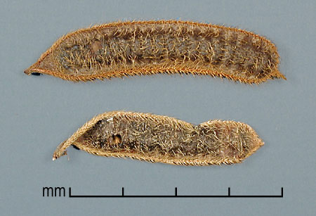 The bristly craspedium and single-seeded craspedium segments are distinctive. Compare with Mimosa diplotricha and with seeds of Prosopis.