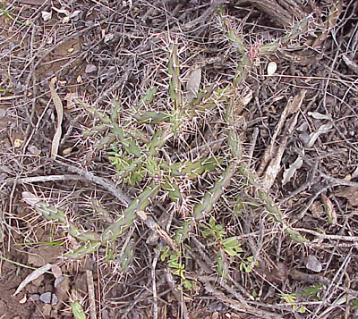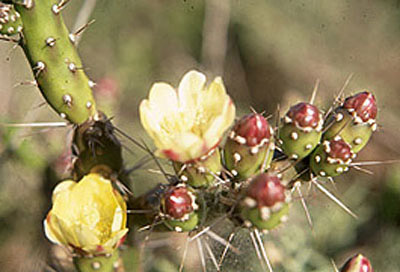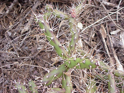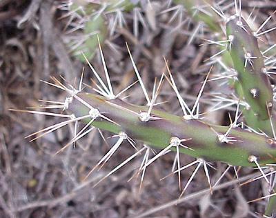 A low-growing succulent usually less than 30 cm tall; narrow stems grayish or dark green to purple, with brownish spines to 3 cm long; flowers yellow, fruits red with purple mottling.