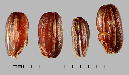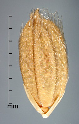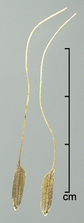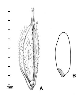 Disseminule (floret with 2 sterile lemmas) oblong or elliptic, ca. 6–11 mm long, 1.6–3.6 mm wide; callus smooth; disarticulation scar lateral. Sterile lemmas similar, glume-like, linear, glabrous, 1.3–7 mm long, 0.3–0.7 mm wide. Rachilla elongated below fertile lemma. Fertile lemma and palea strongly laterally compressed, keeled, cartilaginous, surface scaberulous and tuberculate in a grid pattern. Lemma 6–11 mm long, 1.4–2.3 mm wide, 5-nerved; its margins inrolled, interlocking palea margins; with apical awn to 12 cm long, straight, antrorsely barbed. Caryopsis broadly elliptic or oblong, 5–7 mm long, 2.2–2.7 mm wide, laterally compressed, reddish; hilum linear, as long as caryopsis.