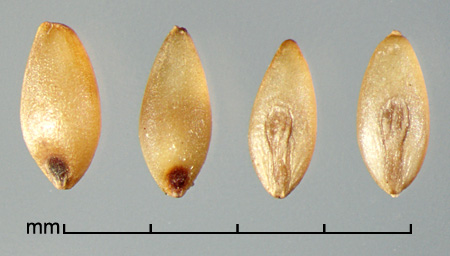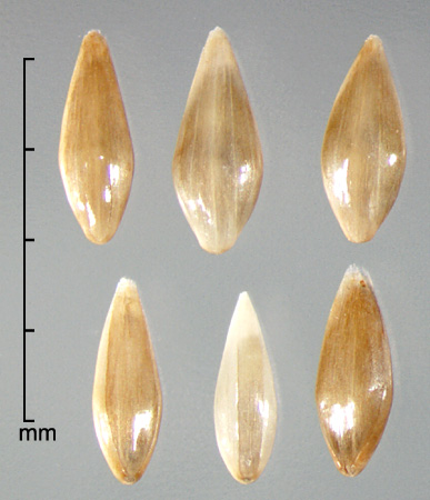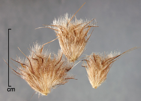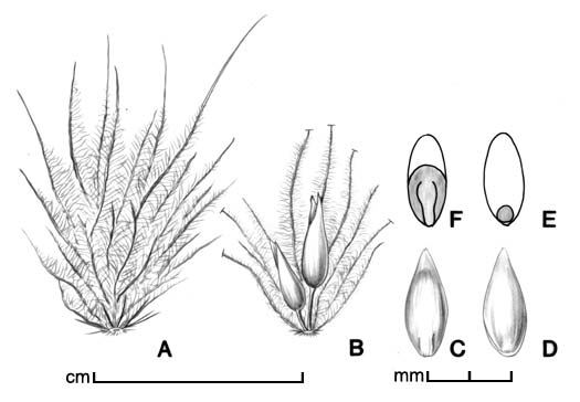 Fascicle consists of unfused bristles; outer bristles 10–20, 1.2–2 mm long, antrorsely scabrous; inner bristles 40–90, 2.2–14 mm long, long ciliate; primary bristle solitary, conspicuously longer than other bristles, to 25 mm, long ciliate. Spikelet cluster of 1 sessile and usually at least 1 pedicellate spikelet; pedicels 0.5–3.5 mm long. Spikelets lanceolate, slightly dorsally compressed, 3.4–6 mm long, 0.6–1 mm wide; consisting of 1 fertile floret and 1 basal sterile floret. Glumes hyaline to membranous; lower glume reduced or absent; upper glume as long as spikelet. Bracts of sterile floret membranous; sterile lemma trilobed, 3.1–4.0 mm long; sterile palea 2.5–3.5 mm long. Fertile floret lanceolate, 2–3 mm long, 0.6–1 mm wide; fertile lemma and palea coriaceous, glossy, translucent, and ciliate at apices. Caryopsis lanceolate, dorsally compressed, 0.5–2.5 mm long, golden brown.