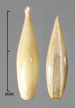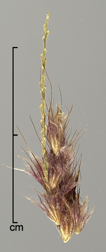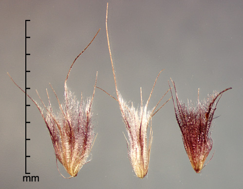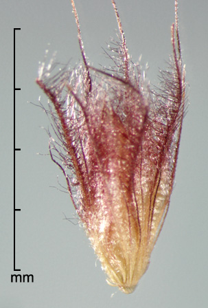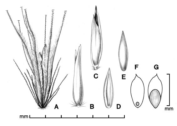 Fascicle consists of unfused bristles; outer bristles 13–30, 1.2–5 mm long, antrorsely scabrous; inner bristles 6–14, 4.3–11.5 mm long, long ciliate; primary bristle solitary, conspicuously longer than other bristles, to 25 mm, long ciliate. Spikelets solitary, sessile, lanceolate, mildly dorsally compressed; 2–5 mm long, 0.6–0.9 mm wide; consisting of 1 fertile floret and 1 basal sterile floret. Lower glume absent or a vestigial scale; upper glume 3–4.5 mm long, glabrous, trilobed. Sterile lemma membranous, as long as spikelet, 5–7-nerved, trilobed, ciliate; sterile palea 2.9–3.7 mm long. Fertile floret cream to light brown, narrowly lanceolate, 1.7–3 mm long, ca. 0.5–0.6 mm wide; fertile lemma and palea coriaceous, glossy, with truncate-ciliate apices, lemma 5-nerved.