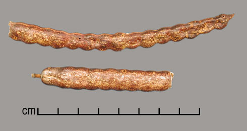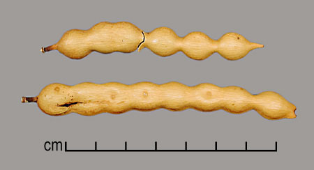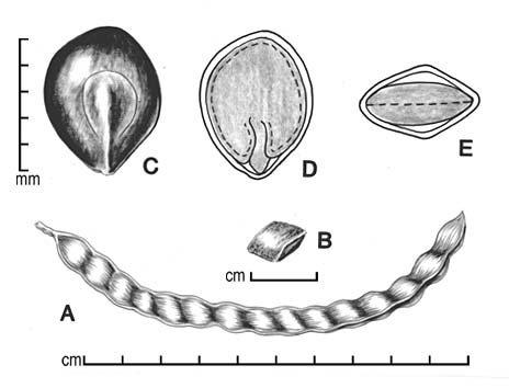 Pods linear, subfalcate or rarely subannular or S-shaped; 7–17 cm long, 6–12 mm wide, ca. 5 mm thick. Short-stipitate, apex short-tapered, margins distinctly undulate (submoniliform), or almost straight. Smooth, straw-yellow, frequently violet-tinged, veins are faint, mostly parallel longitudinal striations; seed chambers 8–18. Endocarp segments subquadrate to ovate, boney, closed, 8–11 mm long, 9–10 mm wide, 4–5 mm thick; mesocarp scarcely pulpy, bitter or sometimes sweet. Seeds oriented longitudinally.