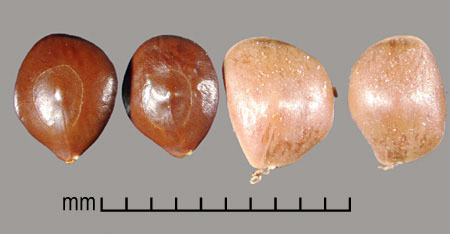 Seeds +/– obovate in outline, 5.5–7 mm long, 2.5–5 mm wide, 2–3 mm thick, with an umbo, elliptic in cross section. Pleurogram average in size. Lens a mound.