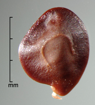 Seeds broadly obovate or broadly elliptic in outline, with an umbo, ca. 4.2–5.2 mm long, 2.6–4 mm wide, 1.5–1.8 mm thick; elliptic, rhombic or irregular in cross section. Pleurogram tilted, open-ended. Lens a mound.