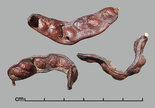 Pods linear, subfalcate or arched, 5–10 cm long, 6–11 mm wide, 5–6 mm thick. Apex short-tapered, with a rounded tip; margins thickened, straight to uneven, nonundulate. Reddish-brown, with striate veins; seed chambers 6–9. Endocarp segments ovate, thin, both faces convex. Seeds oriented longitudinal-obliquely.