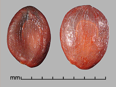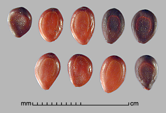 Seeds obovate to broadly elliptic in outline, 6.3–8.5 mm long, 4.5–6 mm wide, 1.7–3 mm thick, without an umbo and sometimes depressed centrally, narrowly elliptic in cross section. Pleurogram with relatively short-arms, broadly open, sometimes distinctly wide and close to margins. Lens recessed, diamond-shaped.