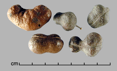 The shape and dull black color of ripe pods is distinctive. The seeds are also distinctive as they are rather large, and have a rather large pleurogram that usually has a pale colored band on its inner border.