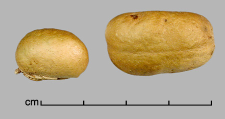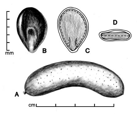Pods cylindric, terete or subterete, straight or falcate to C-shaped, 2.5–7 cm long, 9–18 mm in diameter, with prominent placental suture, very short stipe (sessile). Apex obtuse and mucronate, margins straight, nonundulate. Straw-yellow when ripe, veins obscure; seed chambers not visible. Endocarp segmented, not closed, thin, easily broken; mesocarp spongy, tannic, bitter. Seeds oriented transversely in 2 irregular rows.