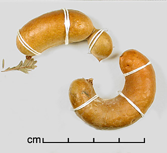 Seeds have a rather small pleurogram. Pods are distinctive because of their cylindric shape, curve, and straw-yellow color when ripe.