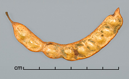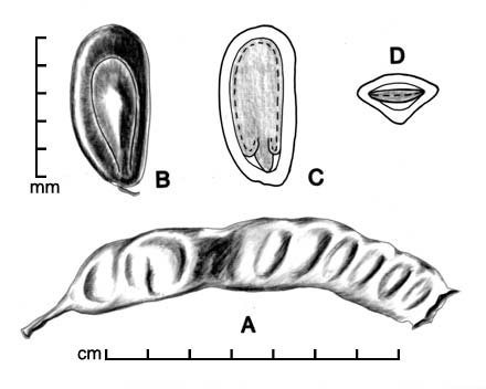 Pods linear, straight or subfalcate to falcate, compressed, 14–29 cm long, 11–18 mm wide, ca. 4 mm thick. Stipitate, acuminate at apex, margins nearly straight. Smooth, straw-yellow when ripe, veins faint, mostly parallel longitudinal ridges; seed chambers 23–32, umbonate before ripening. Endocarp segments subquadrate, boney, closed, broader than long, ca. 5 mm long, 10–15 mm wide, 2–3 mm thick; mesocarp pulpy. Seeds oriented longitudinally.