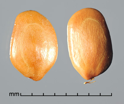 Seeds asymmetrically obovate or broadly oblong in outline, 5–6.5 mm long, 2.5–4.25 mm wide, 1.75–2.5 mm thick, with an umbo, elliptic in cross section. Pleurogram rather wide, with long arms. Lens a light-colored mound.