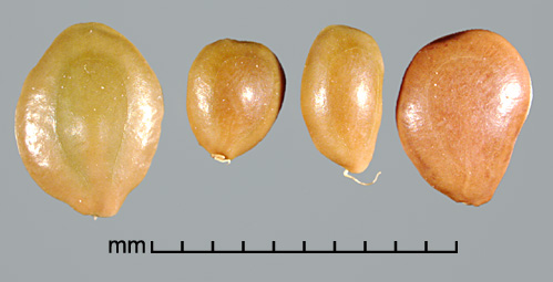 Seeds narrowly to broadly obovate and often asymmetric in outline, 4.25–7 mm long, 2.8–4.9 mm wide, 1.7–3 mm thick, umbo distinct or indistinct, elliptic in cross section. Pleurogram nearly closed. Lens a recessed mound.