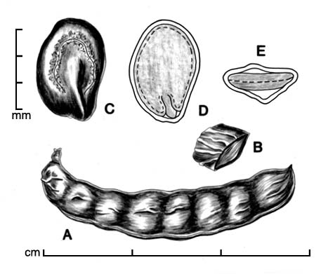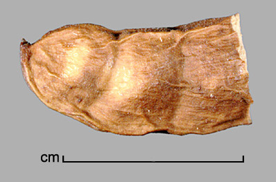 Pods linear, straight or curving slightly, compressed, 3.5–5 cm long, 6–8 mm wide. Short-stipitate, apex mucronate, margins nearly straight, faintly undulate. Reddish, smooth or wrinkled appearance, with longitudinally reticulate ridges; seed chambers 5–10. Endocarp segments subquadrate to rhombic, or broader than long, papery to boney, closed, 4–6 mm long, 5–7 mm wide, 2–3 mm thick; mesocarp thin, dry. Seeds oriented longitudinally.