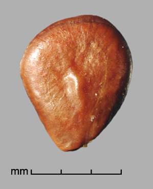 Seeds obovate to rhombic in outline, 3.8–4.9 mm long, 2.2–3.5 mm wide, 1.3–2.7 mm thick, with a ridgelike umbo, asymmetrically elliptic to subrhombic in cross section. Pleurogram bordered with wrinkles. Lens a light-colored mound.