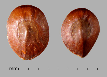 Seeds obovate to broadly elliptic in outline, 4.2–6 mm long, 3.2–4.5 mm wide, 1.7–2.9 mm thick, umbo semi ridge-like, elliptic in cross section. Pleurogram somewhat short-armed, with fine striations radiating out from pleurogram to margins. Lens a dull mound.