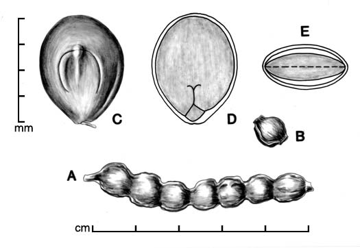 Pods linear, straight, less often subfalcate, somewhat compressed, (5)7–14 cm long, 8–13 mm wide, 2–5 mm thick. Short-stipitate, apex mucronate, somewhat to distinctly constricted between endocarp segments, margins slightly undulate. Dark-colored, usually with longitudinal-reticulate veins; seed chambers ca. 5–16. Endocarp segments subquadrate, hard, closed, 6–7 mm long, 7–10 mm wide, 1.5–3.5 mm thick; mesocarp thin, pasty, bitter. Seeds oriented longitudinally.