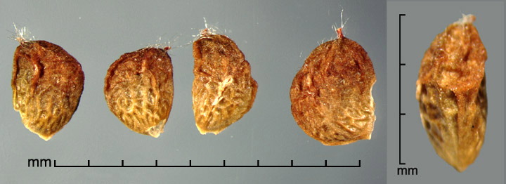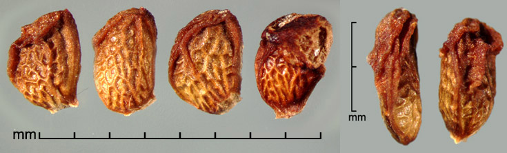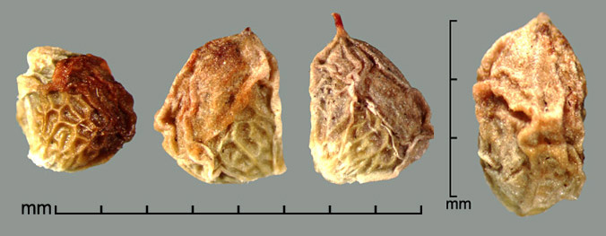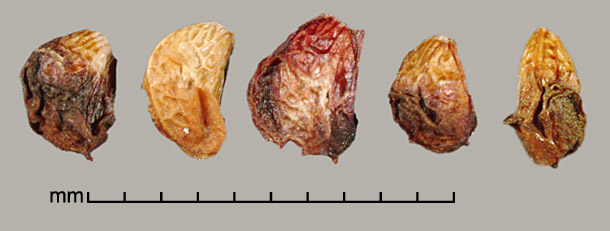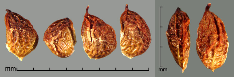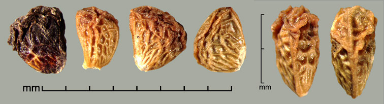 Aggregate fruit a head of many drupelets, each containing one seed. Drupelets narrowly to broadly D-shaped or rounded triangular, ca. 2–3.2 mm long, 1.5–2.8 mm wide, 1–1.8 mm thick. Surface reticulate and/or wrinkled, with varying amounts of adherent pericarp. Color ranging from whitish, straw-yellow, amber, orange-red, reddish black, to nearly black. Embryo spatulate.