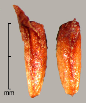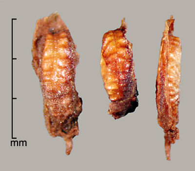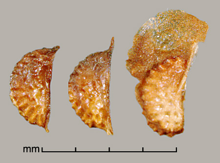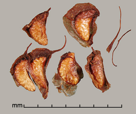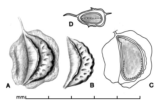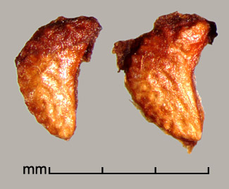 Aggregate fruit of many drupelets, each drupelet containing one seed. Drupelets may bear wings of thin, stiff persistent pericarp extending mostly from margins. Drupelets (not including extensions) 2–2.8 mm long, 0.7–1.5 mm wide, 0.5–1 mm thick. Crescent shaped, sides sloping to ventral concave margin. Sides broadly rugose-reticulate, dorsal margin with broad mostly transverse ridges and a groove down the middle. Style sometimes persistent. Surface dull to semiglossy, yellowish to reddish-brown. Scar inconspicuous. Embryo spatulate, slightly curved, cotyledons expanded, broad.