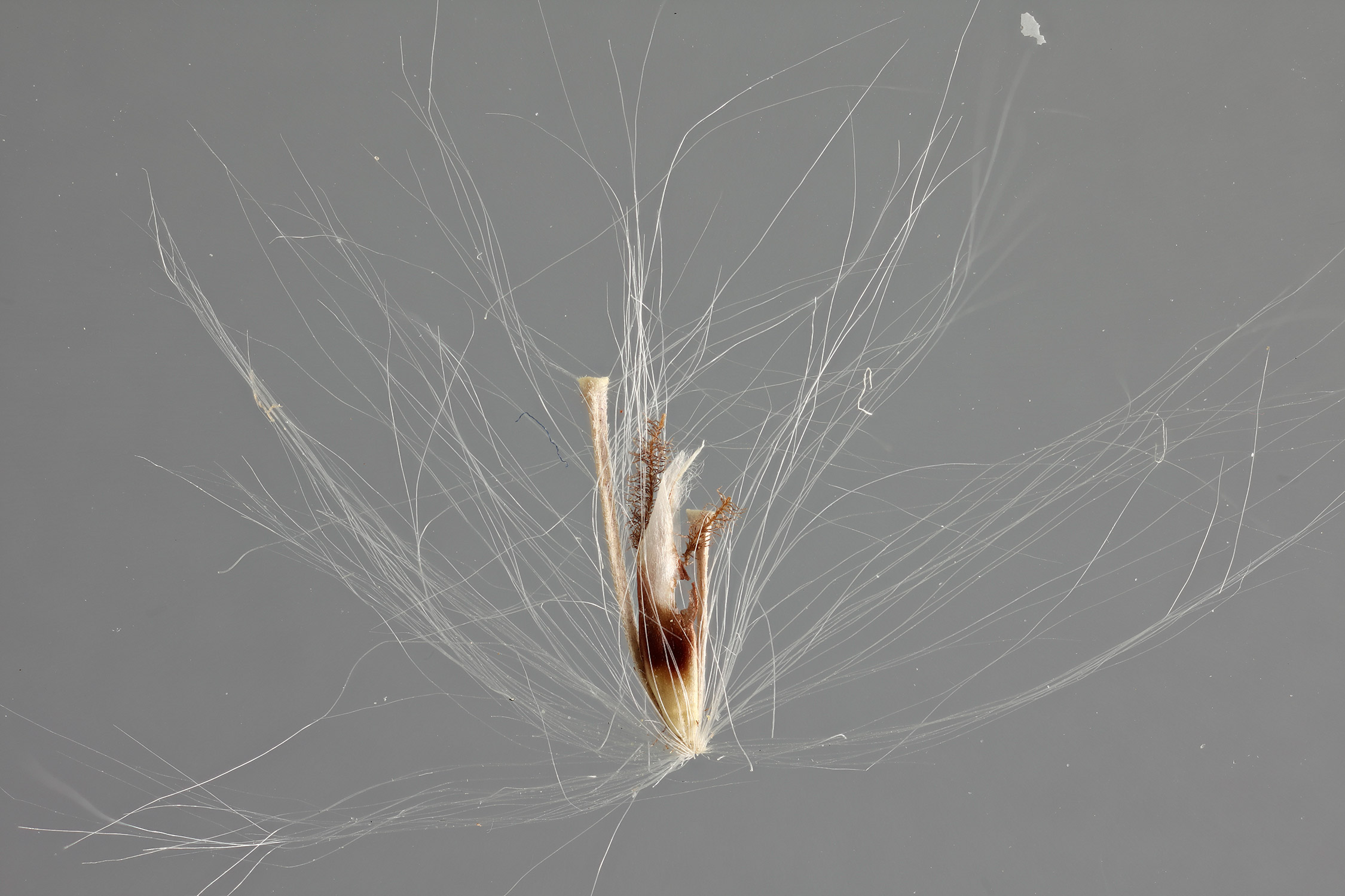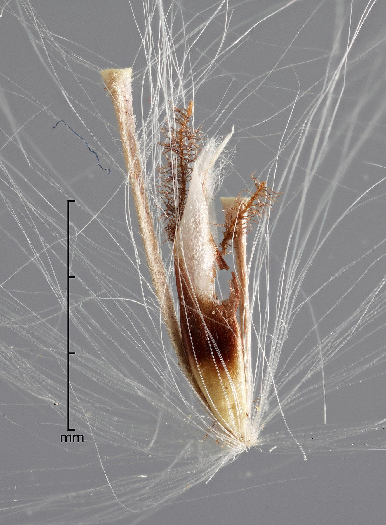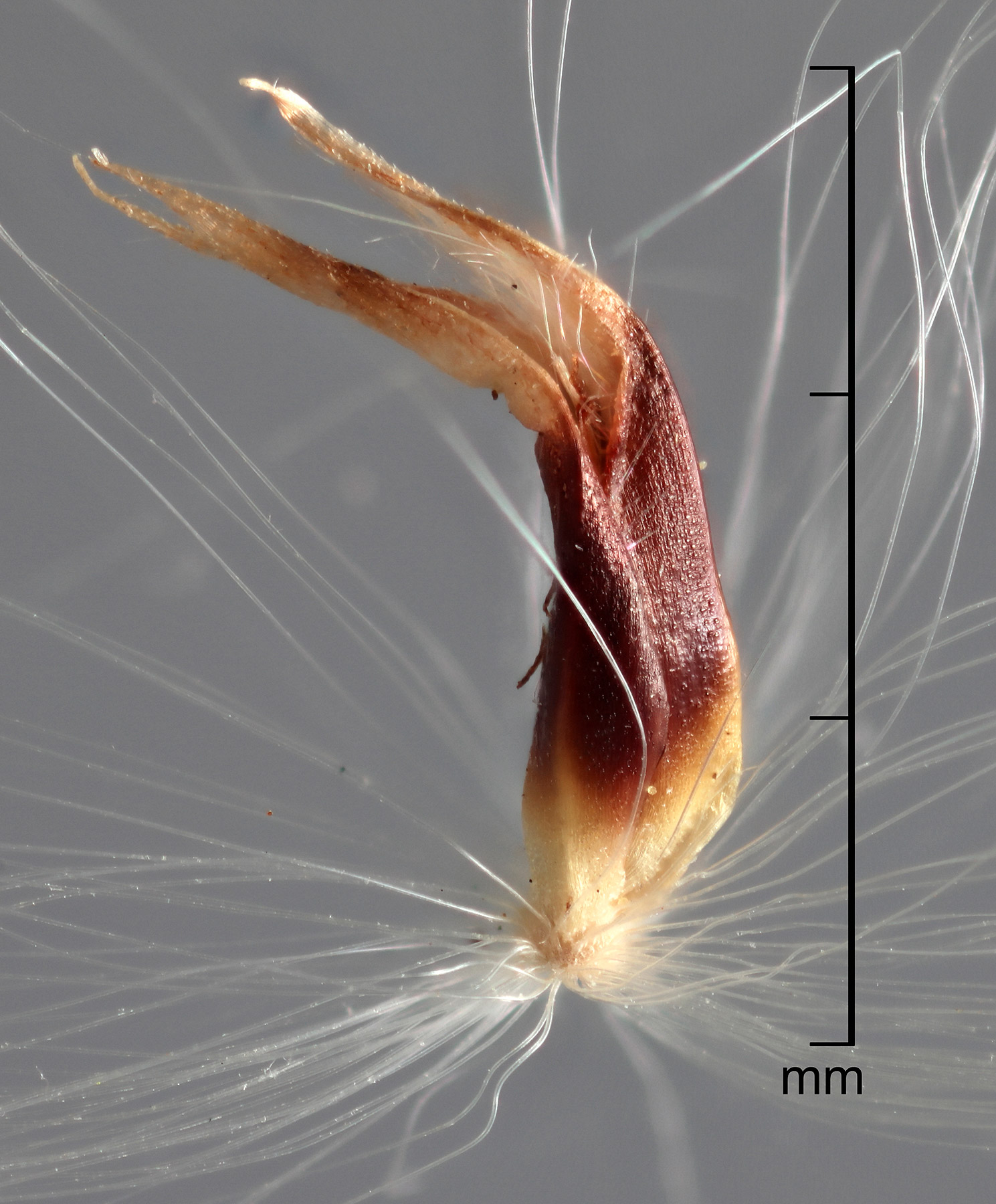 Spikelets homomorphic, ca. 3.3–4.5 mm long, ca. 0.5-0.6 mm wide, awnless, of 1 fertile floret and 1 basal sterile lemma. Spikelet callus with silky silvery hairs 2–3 times longer than spikelet (to 12 mm long). Glumes as long as spikelet, papery (chartaceous), dark brown below middle at maturity, membranous and pallid (pale, white, colorless) above, acuminate, upper margins ciliate; lower glume 2–4 nerved; upper glume keeled. Sterile lemma half as long as spikelet, hyaline. Fertile lemma shorter than sterile lemma, hyaline. Internode and pedicel slender, bearing long hairs; internode ca. 3.4–6.1 mm long, pedicel ca. 1.8–3.5 mm long, apex of pedicel flared and hairy.