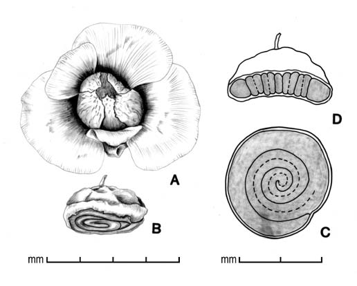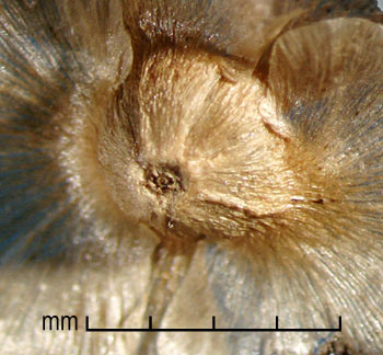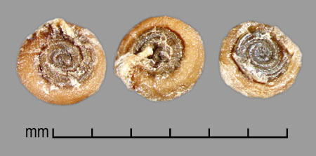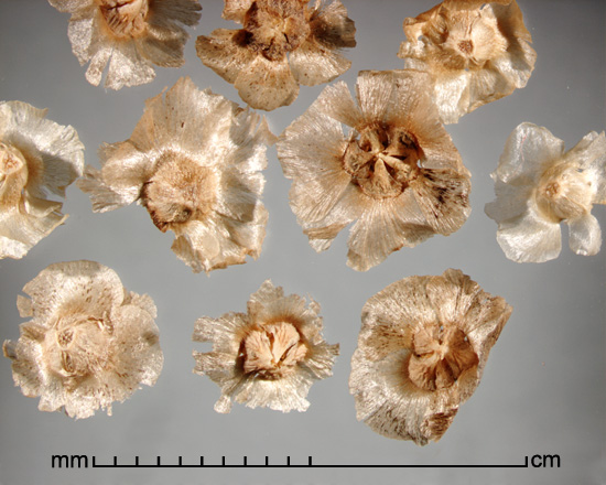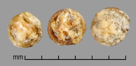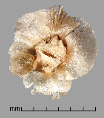 Fruit a 1-seeded utricle with surrounding persistent segmented calyx (sepals), extending into 5 wings: 2 small (minor) wings with expanded limbs, and 3 large, with largest wing between the 2 minor wings. Fruit 6.0–12.0 mm in diameter including wings, 1.0–3.0 mm thick. Wings broad, extending laterally, with fine, light-colored veins; wings usually straw-colored to light brown. Below wings fruit hemispherical, smooth, hardened, often glossy, with a distinct scar. Apex scarious, rough, sparsely pubescent, cone-shaped; triangular calyx segments connivent. Utricle consists of a somewhat flattened spirally coiled embryo covered by thin, membranous pericarp, 2.0–2.5 mm in diameter, 1.0–1.5 mm thick. On one side the retained pericarp forms a ridged cone, on the other a thin layer of pericarp reveals the tightly coiled embryo. Pericarp surface waxy looking, straw colored to orange-yellow, mostly concealing dark brown embryo. Endosperm absent.