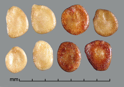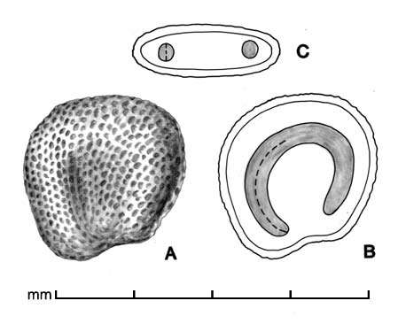 Fruit a berry with 210–220 seeds. Seeds ovate to broadly ovate, broadly elliptic, or nearly circular, infrequently C-shaped in outline, compressed, variously bent or curved due to crowding, 2–3 mm long, 1.5–2 mm wide, 0.3–0.6 mm thick, cross section narrowly oblong to narrowly elliptic. Glossy, light to dark yellowish-brown. Surface reticulations distinctly undulate. Hilum subbasal, marginal, a narrow slit 0.5–0.8 mm long, flush to slightly recessed, slit closed or with a small central +/– circular hole. Embryo linear-curved, seen twice in cross section; endosperm readily visible.