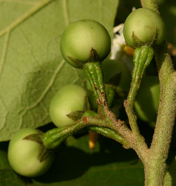 Solanum torvum is a prickly shrub or small tree, up to 5 m tall. It is cultivated in the tropics for its sharp-tasting, immature fruits. The plant may have been introduced into Florida for cultivation trials before 1900 and has been found cultivated there within the last 10 years. This plant forms impenetrable thickets in pastures, preventing animals from grazing. The seeds are dispersed by birds and bats.